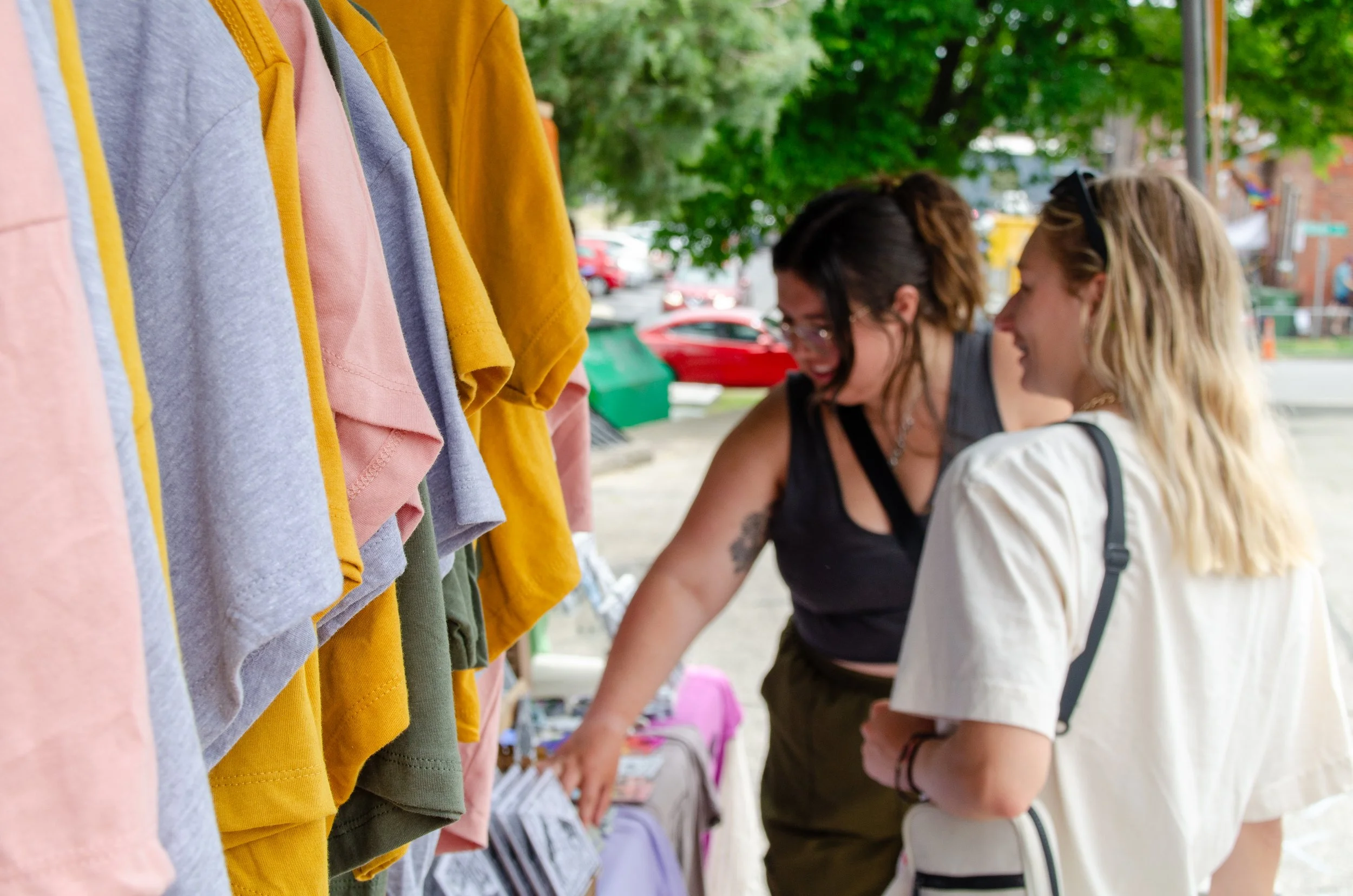 Two people shop for art at the Critter Butt’s Booth (June 2024)